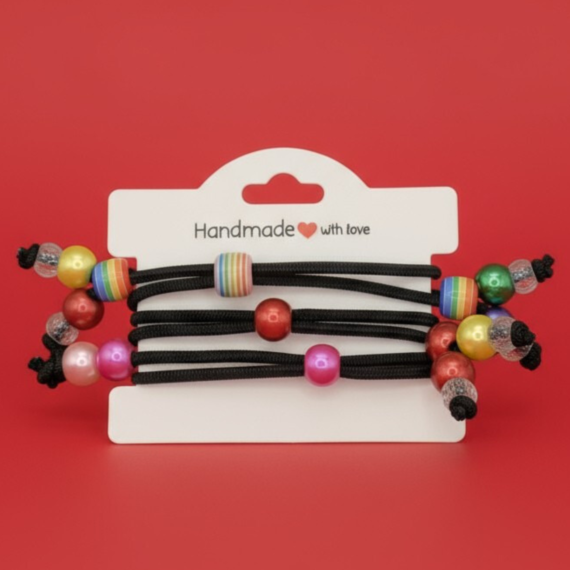 - Pearl-finish beads in rainbow assortments, crimson red, bright yellow, vibrant pink and light pink.